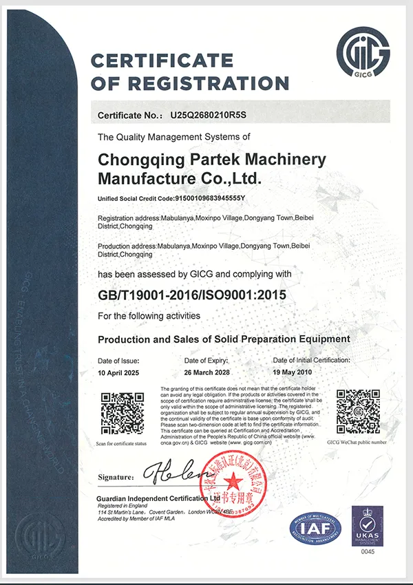 Certificado según el Sistema de Gestión de Calidad ISO 9001:2008; recibió el Certificado de Fabricante Profesional de China CMD, se convirtió en miembro de la Asociación China de Equipos Farmacéuticos (CAPE), registró con éxito la marca Partek