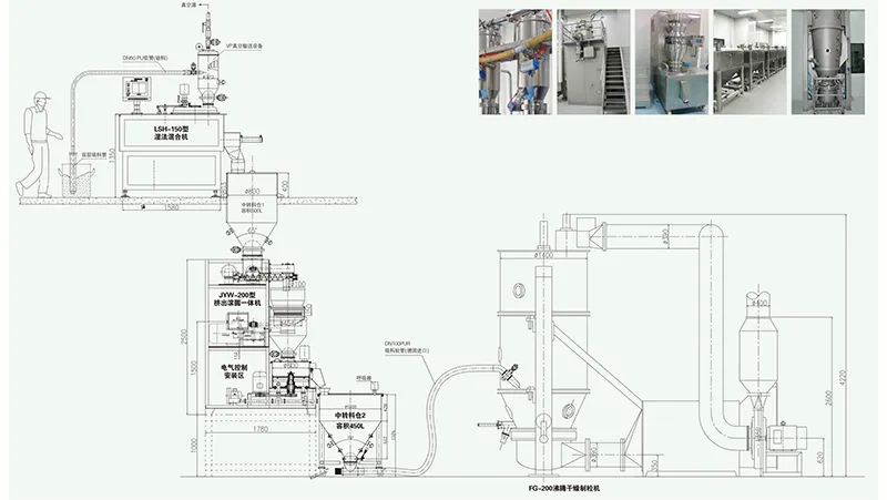 Línea de producción de formulaciones: mezclador húmedo, esferonizador de extrusión, lecho fluidizado, tamizado y llenado.